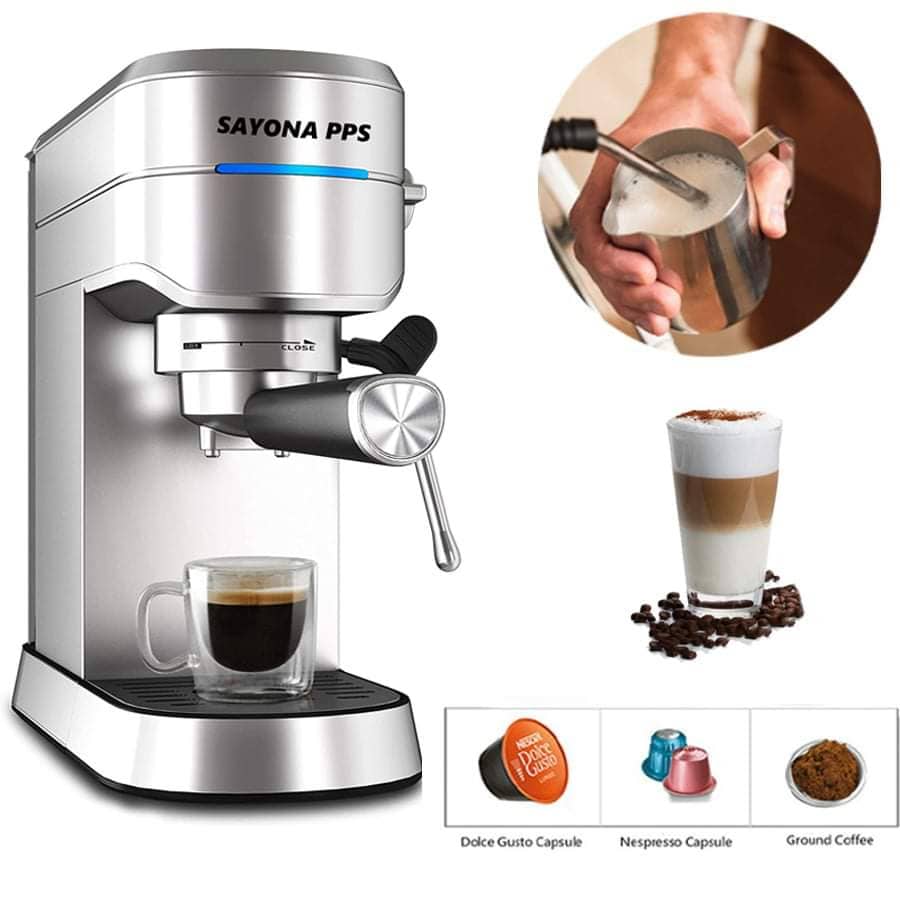 فل ستانلس ستيل 20 بار 5 في 1 يعني ماكينة بتعمل كل اشي بأختصار 3 ماكينات جوا بعض وبشكل اوضح اكثر الماكينة بتعمل الكبسولة لصغيرة والكبسولة الكبيرة وبودره الاسبرسو السنقل وبودره الاسبرسو الدبل وبخار حليب وبسعر ولا بالاحلام